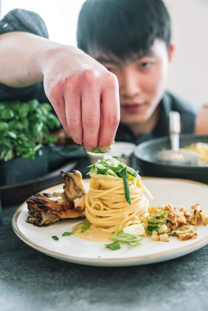 Geniet van een zorgvuldig bereide maaltijd die een harmonieuze mix is van Oost-Aziatische en westerse keuken, waar traditionele smaken samenkomen met moderne technieken. Een unieke culinaire ervaring die het beste van twee werelden aan tafel brengt.