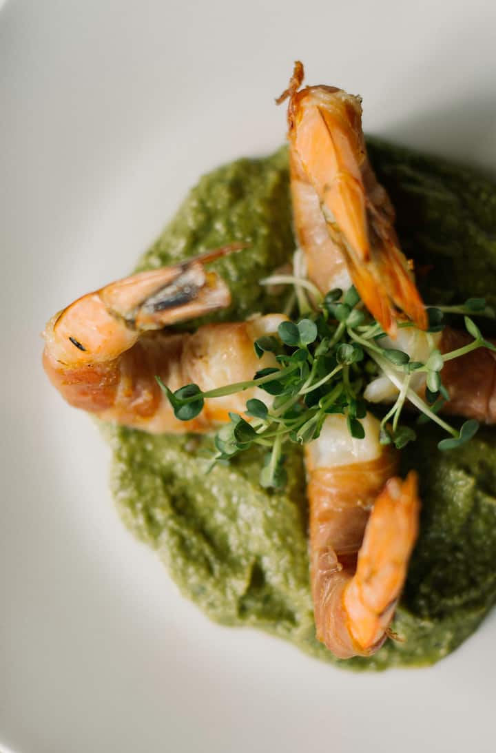 Garnalen of eilandvis met verschroeide citrus en een verse kruiden- en kokoschutney