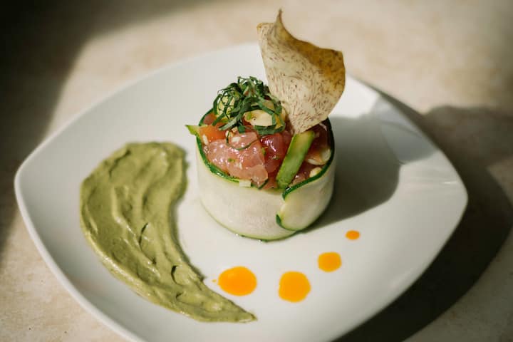Deze avond omvat een fusie van verse Kaua'i-producten en robuuste smaken uit de Pacific Rim.