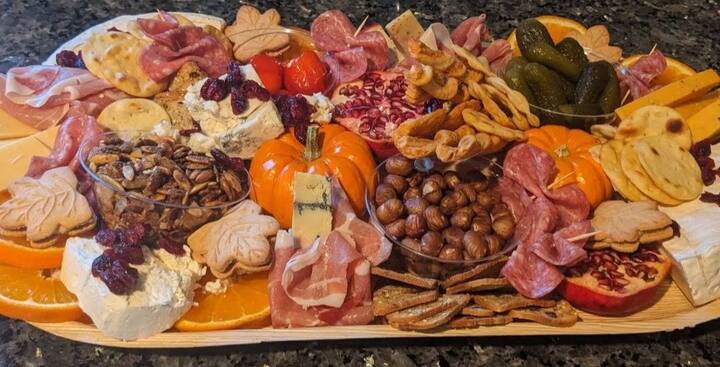 Kleine tot middelgrote groepen genieten van deze charcuterieplank, met een verscheidenheid aan seizoensgebonden vlees en kazen.