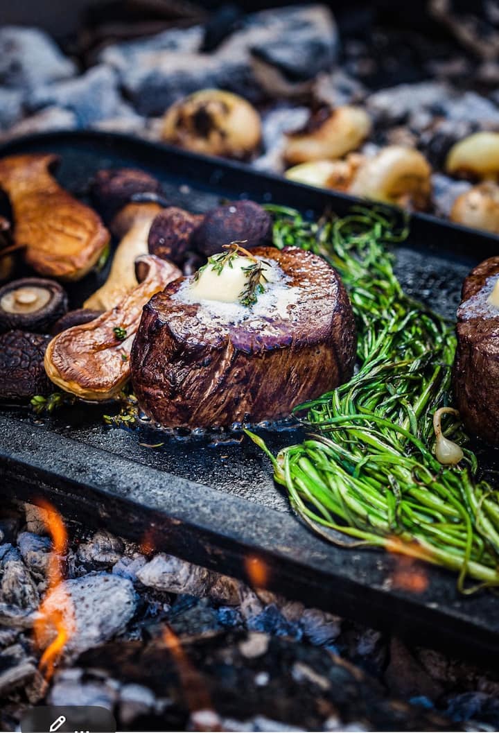 Een perfect gebakken biefstuk is het middelpunt van dit diner, klaargemaakt op de temperatuur van je voorkeur en gerust voor maximale sappigheid. Het is bekroond met een smeltende kruidenboter doordrenkt met knoflook, peterselie en tijm. Hartige oesterzwammen worden gebakken tot ze goudbruin en mals zijn, wat een diepe umami-smaak toevoegt. Geroosterde broccolini zorgt voor een frisse bite en subtiele zoetheid, en balanceert de rijkdom van de biefstuk voor een verfijnde, bevredigende maaltijd.