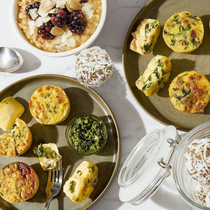 6 items. Deze energieke selectie van chef-kok Jose Garces bevat Bacon & Mozzarella Egg Bites ( spek, mozzarella en spinazie, geserveerd met groene godin dipsaus), Mango-Coconut Overnight Oats (overgoten met bramen, geroosterde kokosnoot en amandelen) en Coconut-Matcha Energy Balls (natuurlijk zoete hapjes die ook cashewnoten, agave en dadels bevatten). Inclusief 2 bestellingen van Egg Bites, 2 Overnight Oats, 2 bestellingen van Energy Balls.