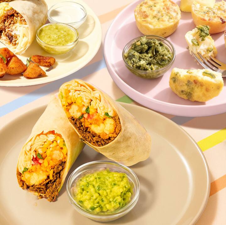 4 items. Een hartige, eiwitrijke en door de chef goedgekeurde ochtendopstelling met Cali Carne Asada Burrito (chef Akhtar Nawab combineert biefstuk, roerei, kaas en tots), Chorizo & Egg Burrito (chef Jose Garces brengt chorizo, adobo-aardappelen, zwarte bonen en queso samen) en Bacon & Mozzarella Egg Bites (chef Jose serveert deze met groene godinensaus). Inclusief 1 Carne Asada Burrito, 1 Chorizo Burrito, 2 bestellingen Egg Bites.