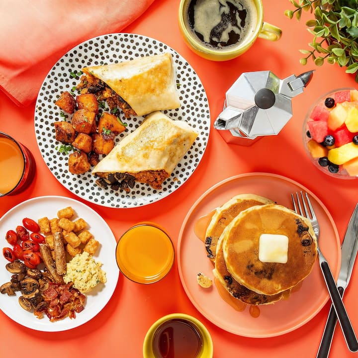 5 items. Een door de chef samengestelde A.M.-opstelling met Cedric's Breakfast Plate (chef-kok Cedric Nicolas serveert roerei, spek, kalkoenworst, tots en meer), Blueberry Ricotta Pancakes (een luchtige traktatie van chef-kok John DeLucie), Cali Carne Asada Burrito (chef-kok Akhtar Nawab combineert biefstuk, roerei, kaas en tots) en Mango-Coconut Overnight Oats (romige haver met bessen en amandelen van chef-kok Jose Garces). Inclusief 1 ontbijtbord, 1 bestelling pannenkoeken, 1 burrito, 2 bestellingen haver.
