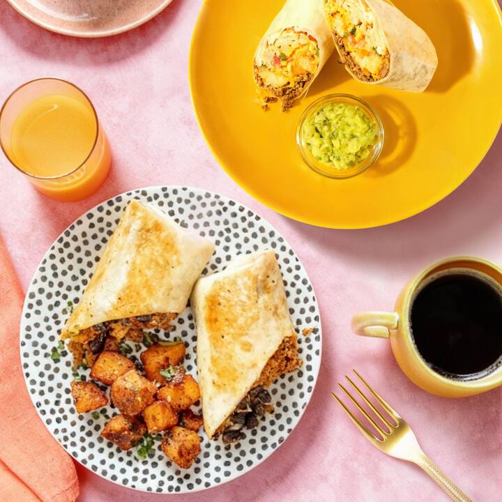 4 maaltijden. Twee chef-koks, twee gedurfde kijk op de ontbijtburrito met Cali Carne Asada Burrito (chef-kok Akhtar Nawab combineert biefstuk, roerei, kaas en tots) en Chorizo & Egg Burrito (de versie van chef-kok Jose Garces brengt chorizo, adobo-aardappelen, zwarte bonen en queso samen). Inclusief 2 van elke maaltijd.