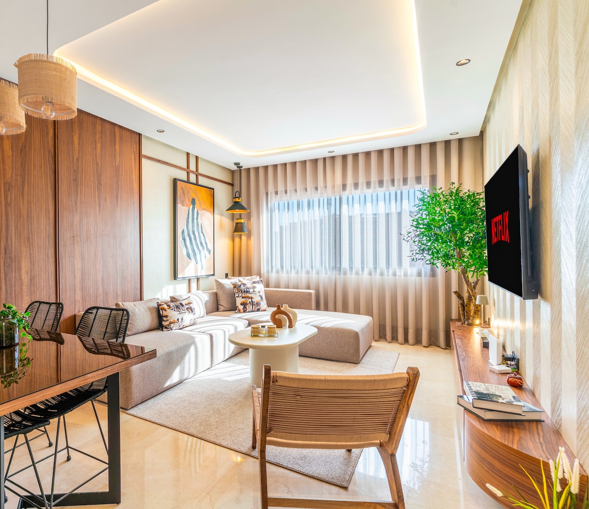 Welkom in ons zorgvuldig ontworpen appartement met één slaapkamer met zwembad, waar positieve energie door elke centimeter stroomt. in het centrum van Gueliz 10 min lopen van carré Eden en de 5 minuten van het station. Perfect gelegen, word je omgeven door een scala aan restaurants, cafés en winkels. Goed uitgerust, we hebben gezorgd voor elk detail, snel internet, IP-tv, Netflix, zorgen voor een naadloze ervaring en maken je verblijf stressvrij