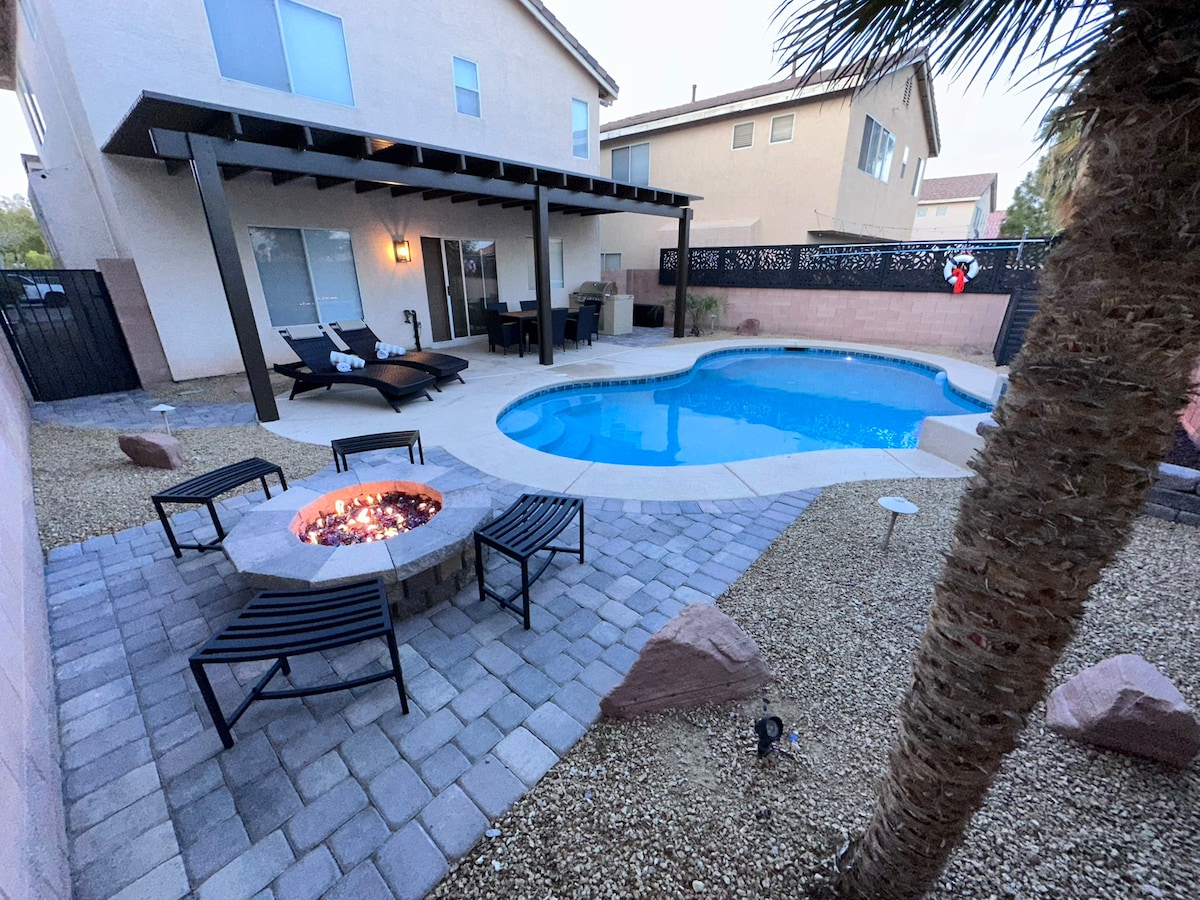 One-story residential home with over 2,200 sq. ft. of inside living space. Large backyard with patio furniture and sparkling swimming pool, all by yourself! 📍Being located in the Heart of the City, home is • 4 miles → Las Vegas Strip • 5 miles → Allegiant Stadium • 5 miles → Convention Center • 7 miles → the International Airport • 2 miles → Chinatown • 8 miles → Downtown Summerlin & Red Rock Canyon National Park