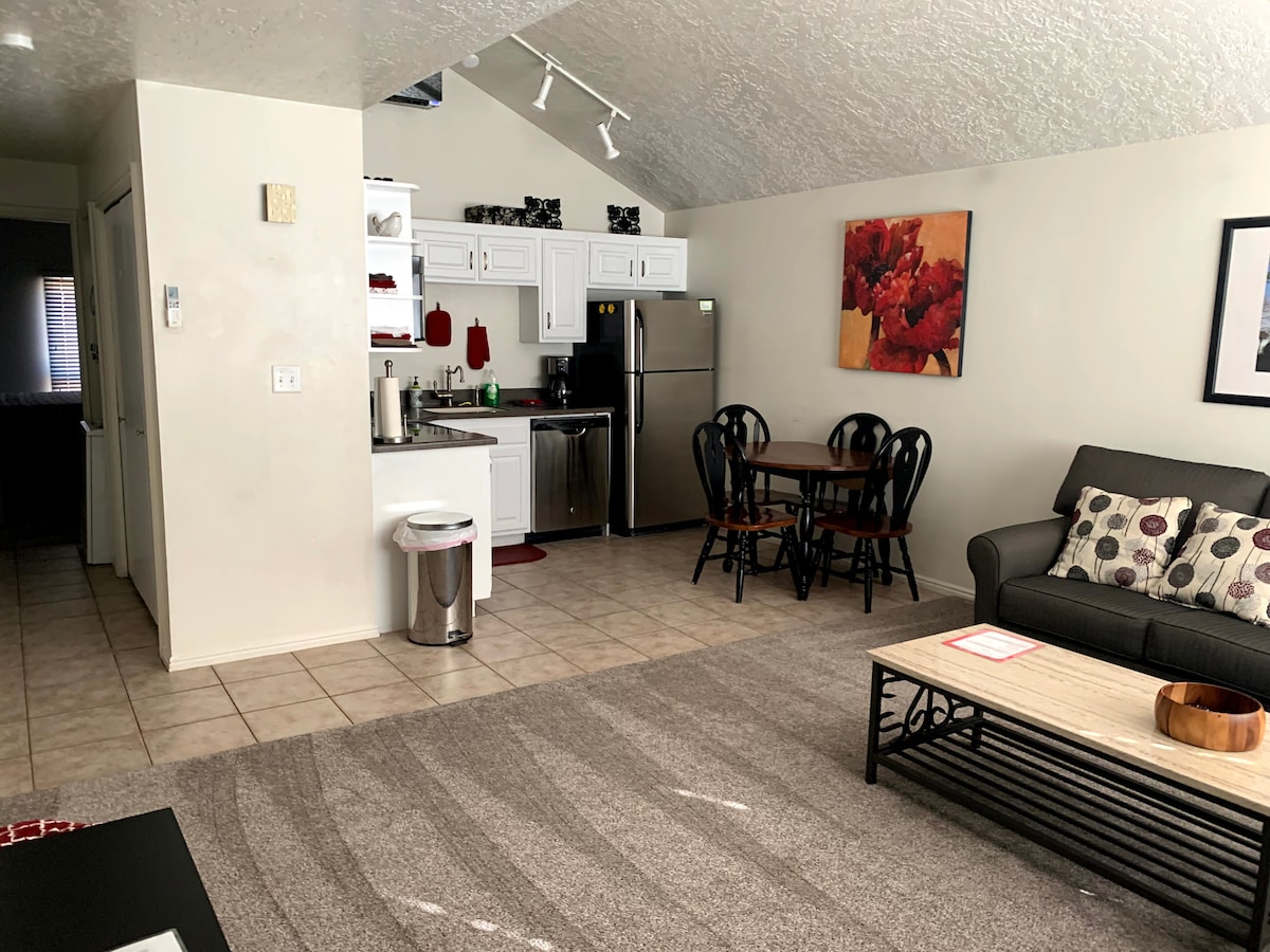 Dit gezellige appartement is volledig gerenoveerd, comfortabel, schoon en gunstig gelegen op Amira Resort, dat alles heeft wat je nodig hebt voor een ontspannen verblijf. Je kunt er 2 slapen in dit studio-appartement met eigen ingang en patio. Geweldige locatie dicht bij alle voorzieningen van het resort, waaronder twee verwarmde zwembaden, jacuzzi, sportvelden en een fitnesscentrum. Het perfecte toevluchtsoord voor het verkennen van St. George, Zion National Park, Snow Canyon, Tuacahn, Sand Hollow en gelegen binnen 5 mijl van 7 golfbanen.