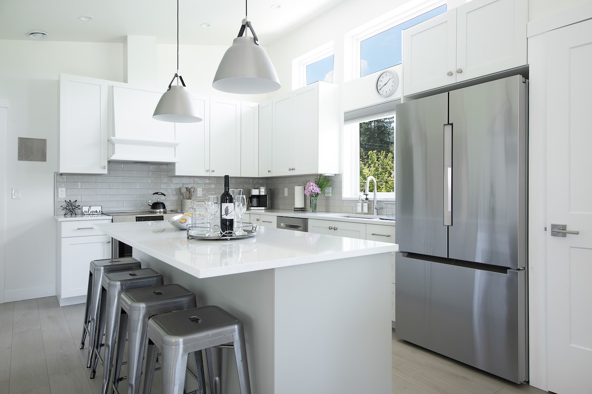 Modern boerderijhuisje aan Lake Sammamish - 2 slaapkamers / 2 badkamers met airconditioning en gashaard. Beide slaapkamers zijn voorzien van zachte dekbedden en kussens. Geniet van hardhouten vloeren, een goed uitgeruste keuken met nieuwe apparaten, wasmachine/droger, eetkamer voor 6 personen, een slaapbank, 55" tv en koffiebar. Ontspan met een diner met uitzicht op het meer, kajak langs de kustlijn of verken de Lake Sammamish Trail net buiten je deur. Goed opgevoede honden zijn welkom!