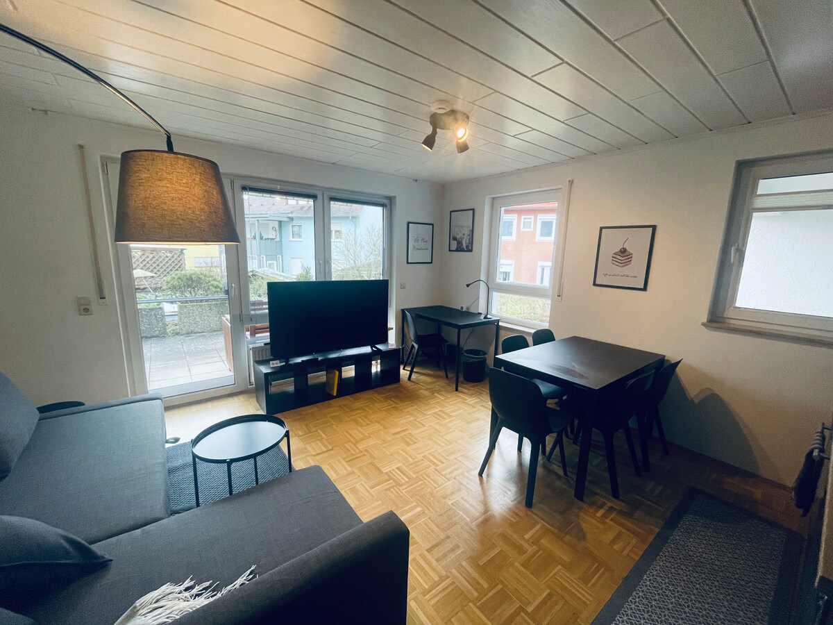 Nieuw, modern ingericht en gezellig appartement met terras. Grote flatscreen-tv met Magenta, Amazon Prime en Netflix. Gratis wifi. Nieuwe keuken en badkamer. 2 1/2 kamers, 60 m². Een bed van 160 x 200 cm, een slaapbank van 140 cm x 200 cm. De woonkamer heeft een airconditioner.