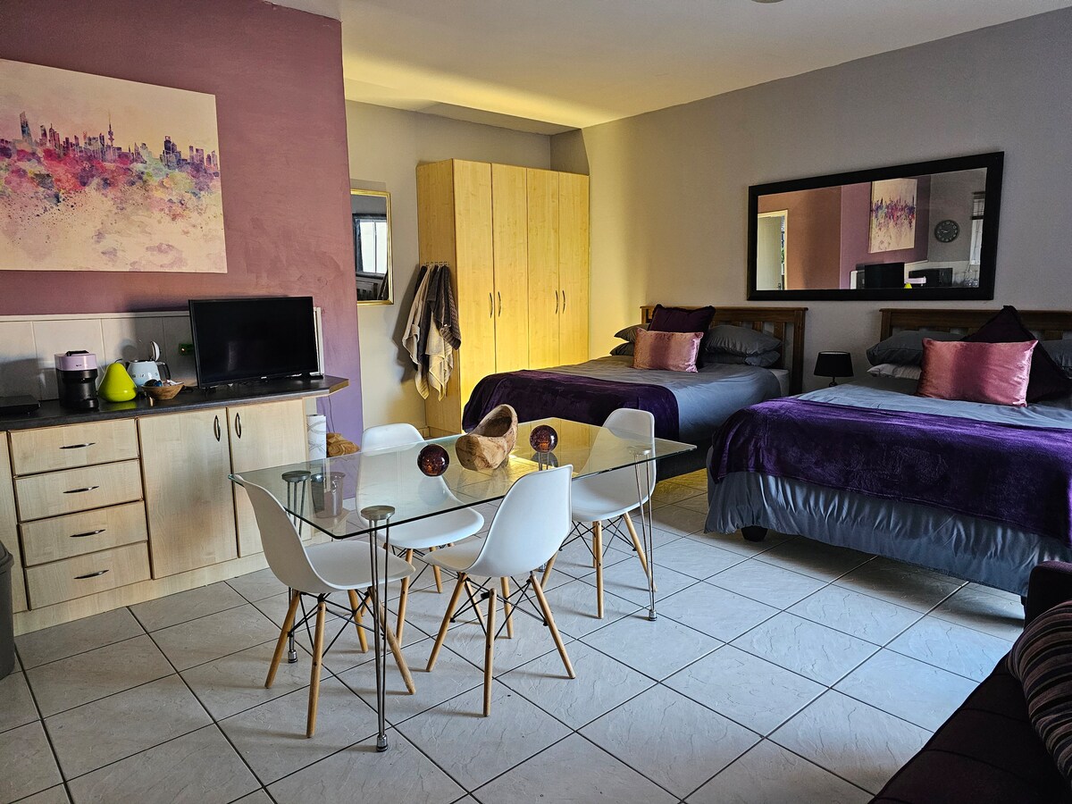 Solar / Battery power and inverter so we are not affected by load shedding . Also equipped with emergency water reservoirs in case of water disruptions SAFE OFF STREET PARKING BEHIND ELECTRONIC GATE OUT OF SIGHT FROM STREET WITH CAMERAS AND SECURITY BEAMS / LIGHTS Room has full DSTV bouquet and Showmax / Netflix and Disney+ and unlimited Wi Fi It is furnished with a queen size bed as well as a modern sleeper couch. En-suite bathroom with Shower / basin / toilet