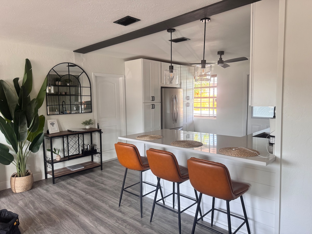 Welkom op onze gelukkige plek! Dit eengezinswoning ligt in een prachtige en rustige buurt, omringd door parken, natuur en een nabijgelegen rivier. Geniet van gratis parkeren, snelle WiFi, slimme 4K-tv 's, een grote tuin, een vuurplaats, een eethoek buiten en een volledig uitgeruste keuken en comfort voor maximaal vier gasten. Het huis ligt op slechts 5-10 minuten rijden van lokale activiteiten, restaurants, Wilton Manors, Downtown / Las Olas en Fort Lauderdale Beach.