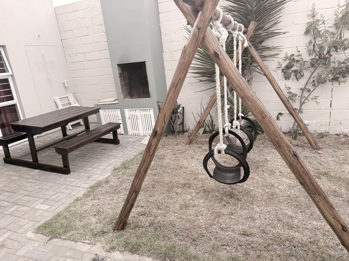 This beautiful cozy, coastal one-storey holiday home boats: 4 bedrooms, with 2 Master bedrooms and a kiddies' room Large screen smart TVs in all rooms (except the kiddies') Reliable Wi-Fi Trampolines and swings to keep the little ones entertained. Indoor and outdoor barbecue and dining areas Functional kitchen Laundry machines/dishwasher Access to 24hr telemedicine support/on-call medical Dr 600m from the beach access to shopping and essential services. 24hr G4S security services Serenity