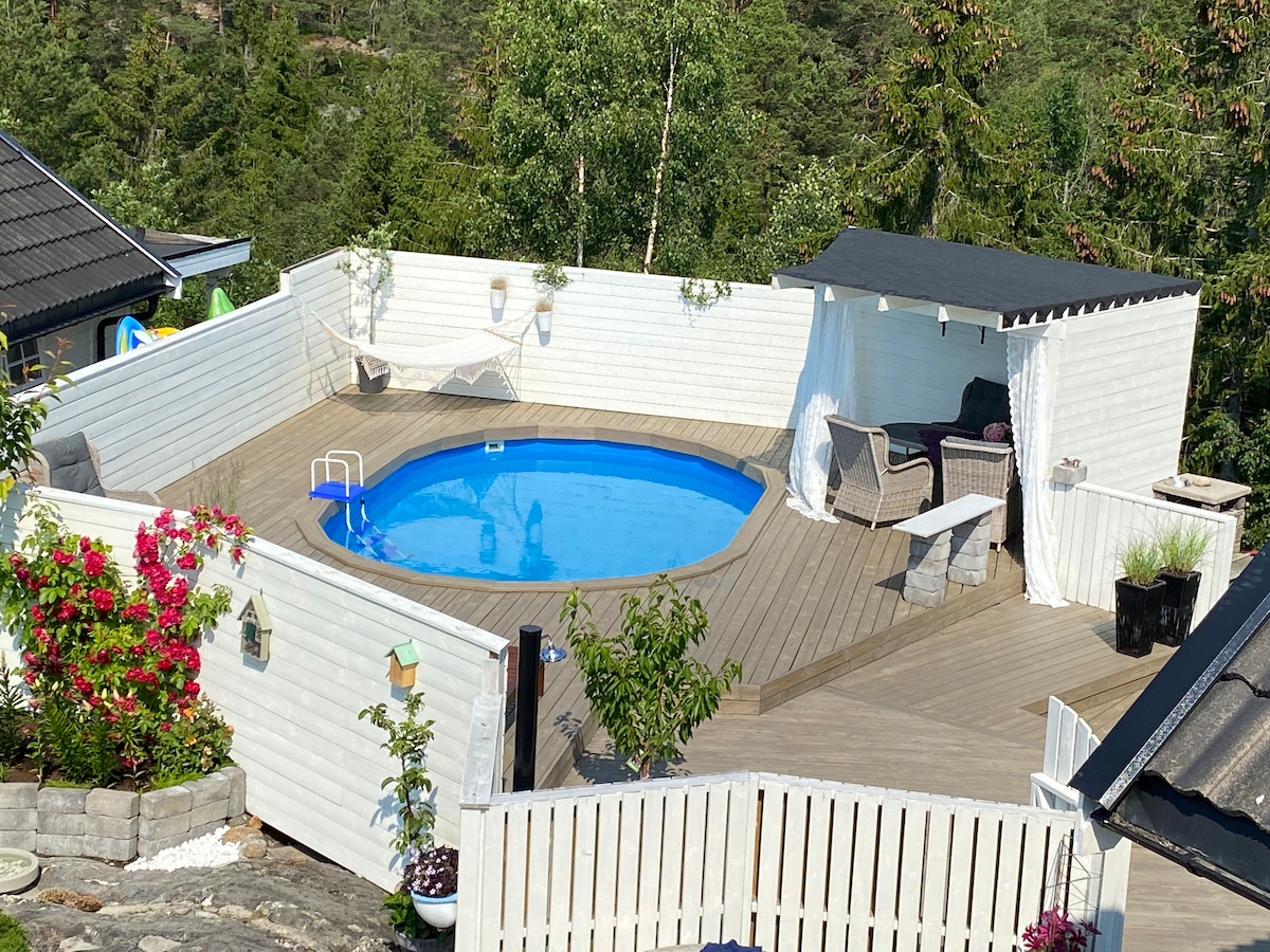 Nieuwe vakantiehuis op Søndeled! Geweldige locatie in een rustige woonwijk met leuke buren en uitzicht op Søndeled fjord. We hebben een grote patio met verschillende zithoeken rond het huis en de barbecue beschikbaar. Eindeloos met wandelgebieden in prachtige zuidelijke natuur voor de deur. Gezellige gemeenschap met supermarkten op 10 minuten lopen van de woning. Een perfect vakantiehuis in het hart van Sørlandet. Elektriciteit is niet inbegrepen en wordt apart in rekening gebracht Het zwembad is van 1 mei tot 1 oktober beschikbaar