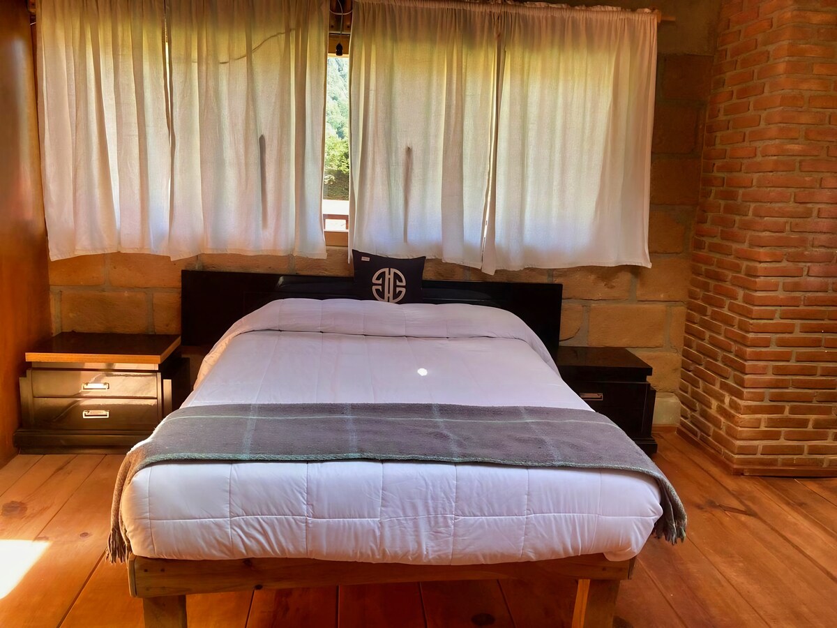 Relájate con tu familia en este hermoso alojamiento rodeado de bosque, donde la tranquilidad se respira en cada rincón. Disfruta de pista de bicicletas, jacuzzi, cancha de fútbol, cine al aire libre, palapa con chimenea y servicio de cocina con productos locales. Todo a solo 20 minutos del centro de Valle de Bravo. Hospédate en Encino, nuestra acogedora cabaña de dos niveles con sala, baño privado y terraza con vista al bosque en la planta baja; y mezzanine con cama king size.