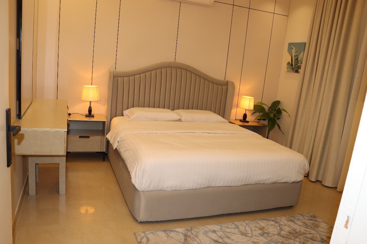 Een luxe appartement met elegantie, rust, modern design, bestaande uit een slaapkamer, hal, toilet, koffiehoek, kleine koelkast, magnetron en de locatie (in de buurt van de watertank - in de buurt van diensten - moskee voor het appartement - National Life Hospital - boodschappen - wasserijen - restaurants en in de buurt van Mojan Park (Mall) - Riyadh Walk