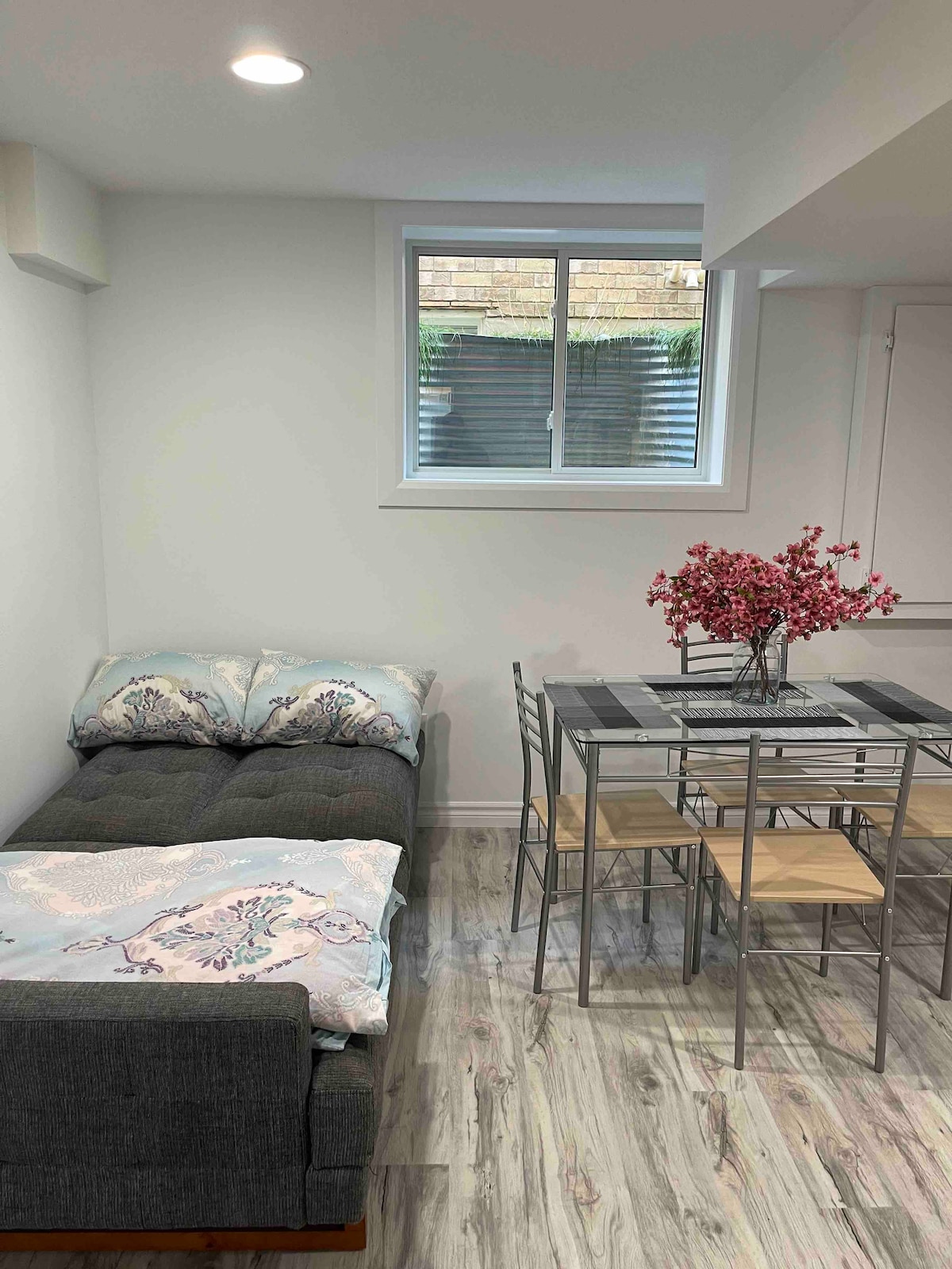 We hebben onlangs onze kelder gerenoveerd om een stijlvolle, moderne, gezellige en rustige gastsuite te creëren. Er is een zij-ingang die direct op de trap uitkomt en je naar de unit brengt. Er is een metalen buitendeur op slot voor geluidsisolatie en beveiliging. De accommodatie is een licht studio-appartement met drie grote ramen, een complete keuken, een zithoek met tv en open haard, een eettafel, een queensize bed, een inloopkast en een eigen badkamer met een douche van vijf voet. Met uitgebreide geluidsisolatie!
