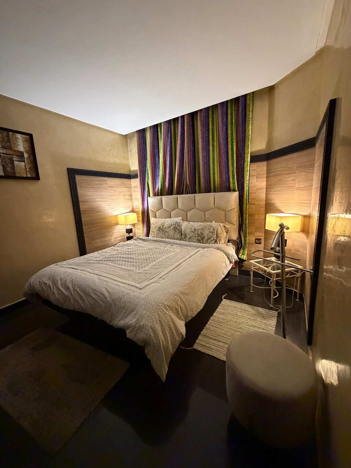 Appartement de 100 m², idéalement situé sur boulevard Mohammed V, en plein cœur de Khemisset. Parfait pour les familles, cet appart comprend 2 chambres a coucher, 2 salons, une salle à manger, une cuisine entièrement équipée et une salle de bain. Profitez d'une smart TV et d'Internet haut débit. L'immeuble est calme et sécurisé, avec un café au rez-de-chaussée et une salle de jeux avec tables de billard et Snooker et stations PS5 de jeux pour les enfants. Parking securisé et gratuit dispo.