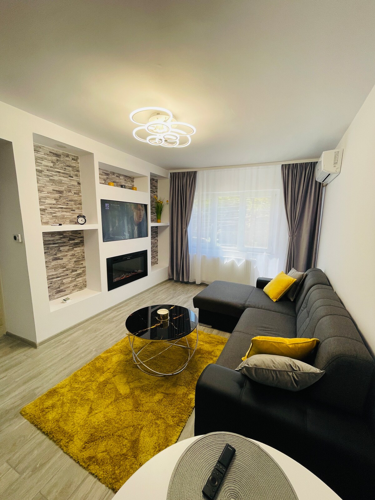 Nieuw, licht appartement in modern design en gratis parkeren. Het ligt bij de ingang van Timisoara, in de buurt van het tankstation Esso. Het appartement is voorzien van: - vloer volledig uitgerust met het nodige: elektrisch fornuis, oven, oven, vaatwasser, koelkast, koelkast, koffiezetapparaat en servies. - Open ruimte waar gasten kunnen genieten van een film, op een comfortabele bank, op een smart-tv, op een smart-tv - slaapkamer met kingsize bed --stam met douchecabine en wasmachine met droger.