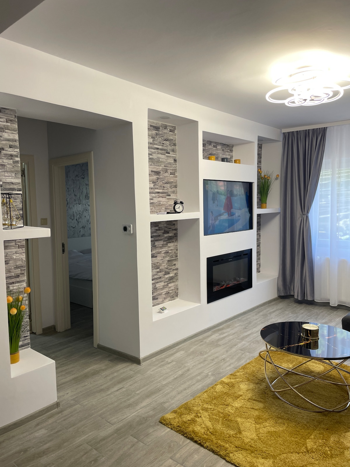 Nieuw, licht appartement in modern design en gratis parkeren. Het ligt bij de ingang van Timisoara, in de buurt van het tankstation Esso. Het appartement is voorzien van: - vloer volledig uitgerust met het nodige: elektrisch fornuis, oven, oven, vaatwasser, koelkast, koelkast, koffiezetapparaat en servies. - Open ruimte waar gasten kunnen genieten van een film, op een comfortabele bank, op een smart-tv, op een smart-tv - slaapkamer met kingsize bed --stam met douchecabine en wasmachine met droger.