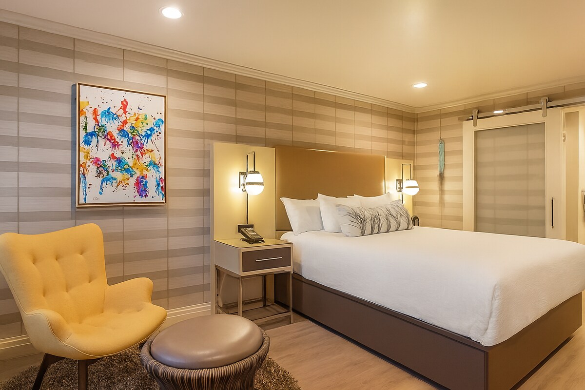 Ontspan in onze kleurrijke Venice, LA-accommodaties in The Kinney, van onze beter-dan-basiskamers tot de Crash Pad Suites. Elk van onze onlangs gerenoveerde hotelkamers heeft een iconische pop art-inrichting en moderne voorzieningen en beschikt over een Simmons BeautyRest Pillow Top Bed voor je beste nachtrust, een 55-inch HDTV, een minikoelkast, Marley-koffie en Tazo-thee, luxe toiletartikelen, gratis draadloos internet,