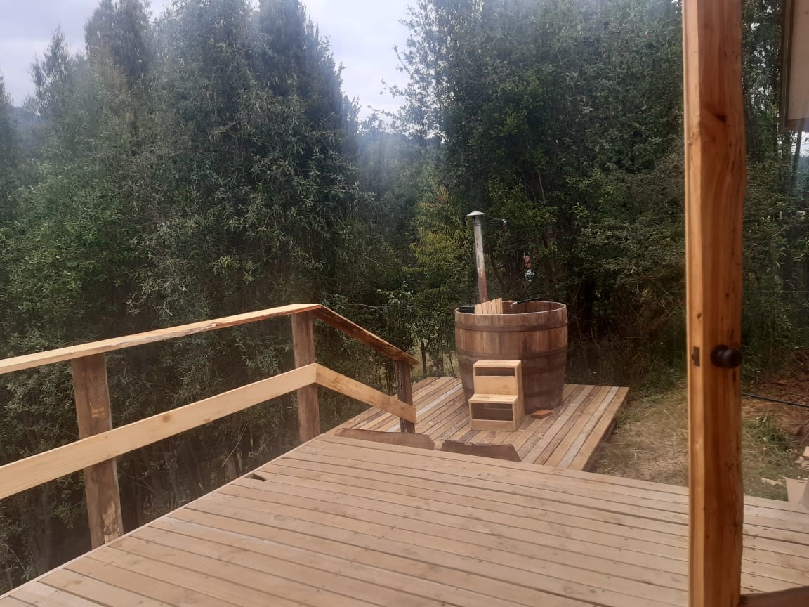 Containerhut met bubbelbad, aan de oevers van de Rio Bueno
