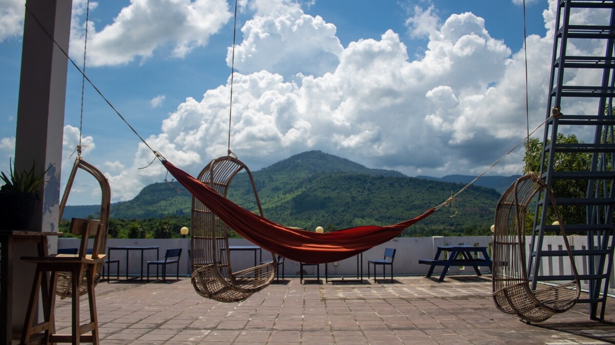 Deze hut ligt in de uitlopers van de bergen en maakt deel uit van een gedeeld pand met een prachtig verhoogd uitzicht op het Cambodjaanse platteland. Deze hut met één slaapkamer en een kingsize bed en een eigen badkamer beschikt over een kleine kitchenette met een minikachel en een koelkast voor je gemak met eigen kookgelegenheid. Er is ook gedeelde toegang tot een groot overloopzwembad ingebouwd in de rotsachtige berg, aangrenzende verzonken zithoek met houten stoelen, ligstoelen bij het zwembad en parasols.