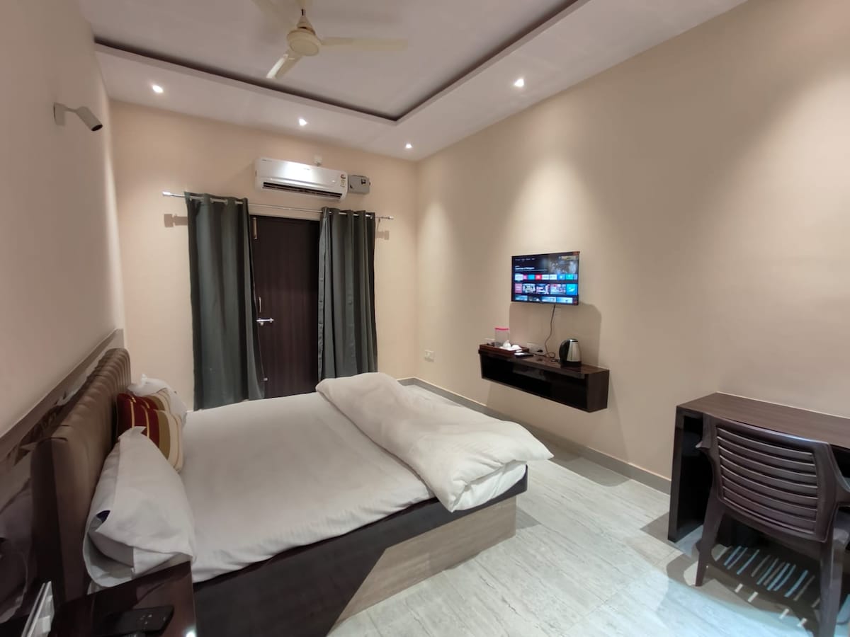Deze comfortabele kamer met airconditioning ligt in Rajinder Nagar, in de buurt van Karol Bagh, en biedt een ruim bed, een aangrenzende badkamer (24 uur warm water), een kitchenette (inductiekookplaat) en een bureau (snelle wifi). Het heeft een onovertroffen locatievoordeel, op slechts een wandeling van Shankar Rd, in de buurt van topziekenhuizen zoals Gangaram, BLK, perfect voor mensen op werk/reizen/patiënten en zorgverleners. Het heeft ook een coole zitplaats bij de ingang waar je kunt ontspannen. Rustige, groene omgeving. Snelle toegang tot winkels, restaurants en gezondheidszorg.