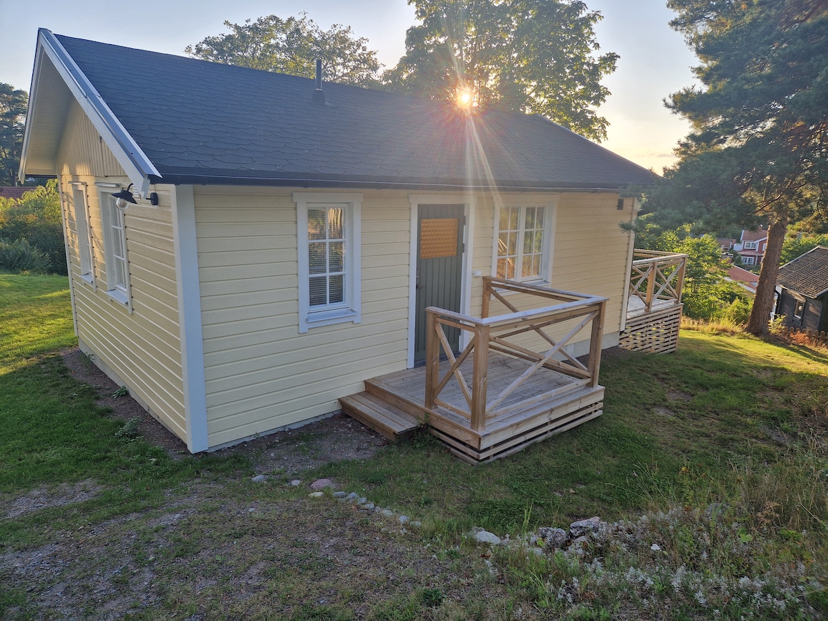 Mini-villa met wat uitzicht op zee en zonnedek gebouwd in 2019. Badkamer met douche, toilet en wasmachine/droger. Keuken; kookplaat met inductie, magnetron, vaatwasser, koelkast met vriesvak. Loft met tweepersoonsbed gemaakt van twee veermatrassen. Niet volledige hoofdruimte boven op zolder. Woonkamer met keukentafel +stoelen en slaapbank. Huur onze fietsen en of kano om Björnö Natuurreservaat en de archipel te verkennen. Twee minuten lopen naar het dichtstbijzijnde strand.