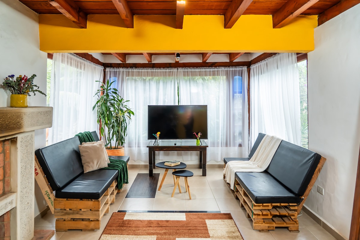 Moderno apartamento campestre a solo 10 minutos de Villa de Leyva, en zona tranquila y segura. Con 100m², el alojamiento cuenta con dos habitaciones, dos baños, sala principal con chimenea, sala de TV y con otros implementos necesarios para tu comodidad. La terraza de 35m² está equipada con un comedor auxiliar y BBQ a gas ideal para los amantes de los asados al aire libre. Todos los espacios están diseñados para descansar, conectarte con la naturaleza y disfrutar con tu familia y amigos.