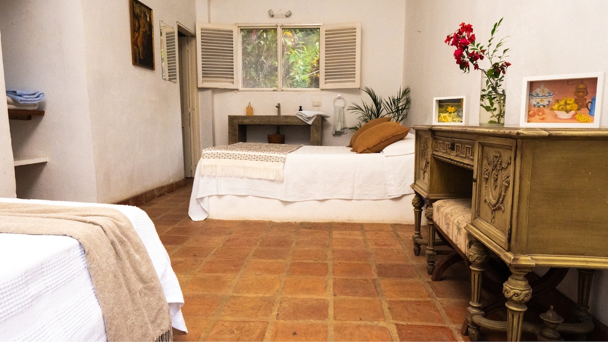 Rust uit in een gezellige kamer in Hacienda Yaraguá, een oud familiehuis omgeven door weelderige tuinen, eeuwenoude ceiba's en kleurrijke heliconia's. Geniet van vogelgezang, de rust van het platteland en toegang tot ons buitenzwembad. Inclusief zelfgemaakt ontbijt geserveerd met liefde. Ideaal om even los te koppelen en weer in contact te komen met de natuur.