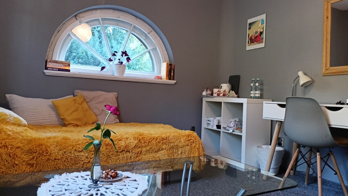 Mieszkanie zlokalizowane jest na parterze w dawnej fermie z 1887 roku z powierzchnia ok 40 m2. Do dyspozycji gości oddzielna sypialnia z dwoma łóżkami, kuchnia z płytą grzewczą, lodówką, czajnikiem elektrycznym, mikrofalówką oraz zestawem naczyń do przygotowania posiłków. W kuchni jest również rozkładana kanapa na dwie osoby, mniejszego komfortu niż łóżka w sypialni;) Klimatyczna łazienka z prysznicem. Przestrzeń dedykowana dla 1- 4 osób. Możliwość przyjazdu z psem. internet światłowodowy