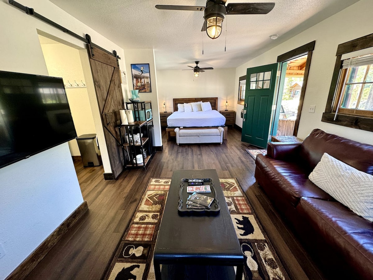 Deze charmante Grand Lake-houten huisje is centraal gelegen. Een perfecte uitvalsbasis voor je vakantie in Rocky Mountain National Park en Grand Lake. Klein op 695 SF. 1 slaapkamer, maar ook een zelfopblazend 16'' queensize luchtbed dat goed werkt in de woonkamer of veranda. Grote omheinde privétuin perfect voor barbecues en de honden om rond te rennen en vrij te spelen. Volledig gevulde keuken met roestvrijstalen apparatuur en gasfornuis. Extra ontbijthoek in de hut met bureau, perfect voor werken op afstand.