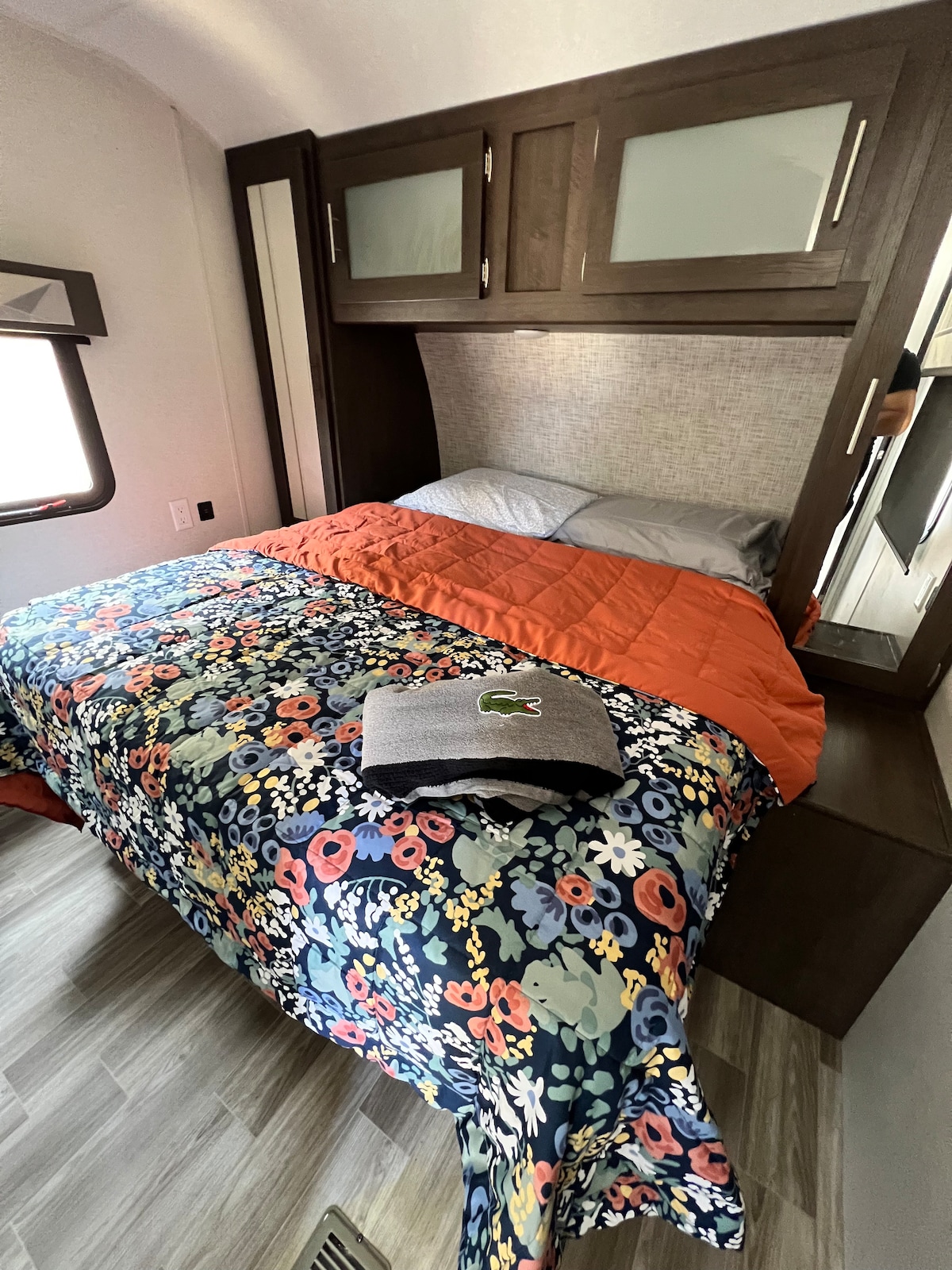 33 voet camper met een bed en uitklapbare bank 2 ligstoelen voor het kijken van tv wat ruimte buiten aangesloten op een 240v stopcontact. Sms ons als je vragen hebt.