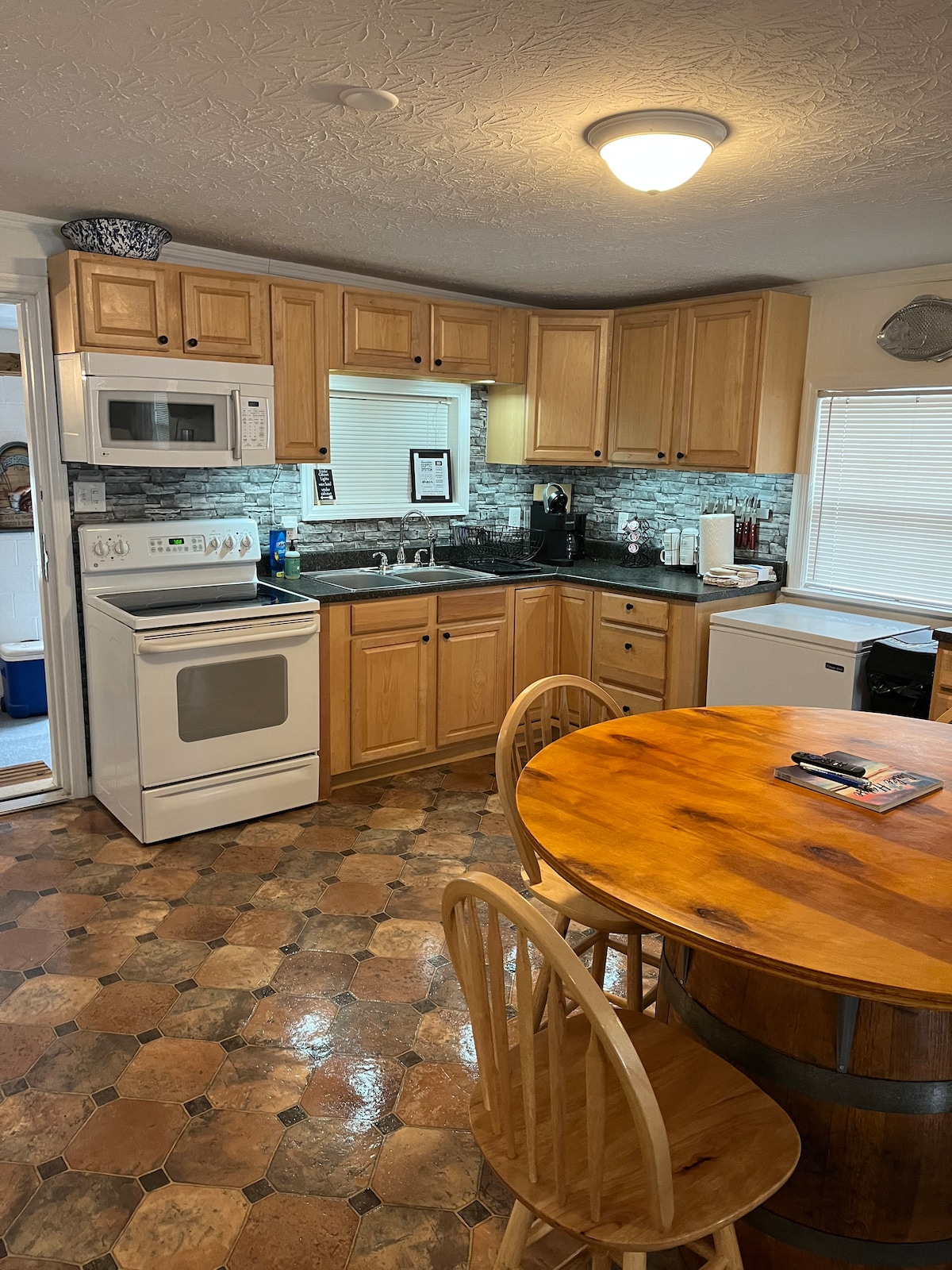Deze prachtige boerderij heeft veel voorzieningen, 3 slaapkamers, 2 badkamers. Koffiebar, Leuke achtertuin met vuurplaats, Weber gasgrill, 6 campingstoelen om bij het gezellige haardvuur te zitten en maïsgat en basketbaldoel voor extra plezier! Volledige veranda aan de voorkant en mooie rustige veranda aan de achterkant. Wasmiddel, shampoo, propaan, wasmiddel enz. inbegrepen. 4 flatscreen-tv 's. Activiteiten voor kinderen. Schommelset, Gelegen op 5 minuten van Beaver Creek Marina , 15 minuten van Conley Bottom en minder dan 5 minuten van de stadsgrenzen.