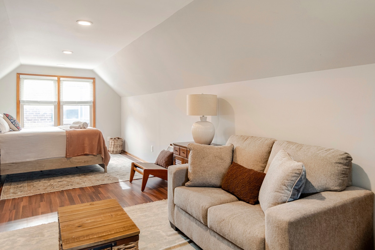 Ferndale retreat! This home has a living room for five (laying), a pro office, art-filled walls, premium sound, wet bar, and a fully equipped kitchen. Walk or bike to downtown, a brewery, and jazz club. Includes 6 kettlebells, 350 G Wi-Fi, 2 Smart TVs, 2 bikes, a king bed in the basement bedroom, and laundry. Espresso For show only. Baby gate for basement. May need to move wet bar for kids.