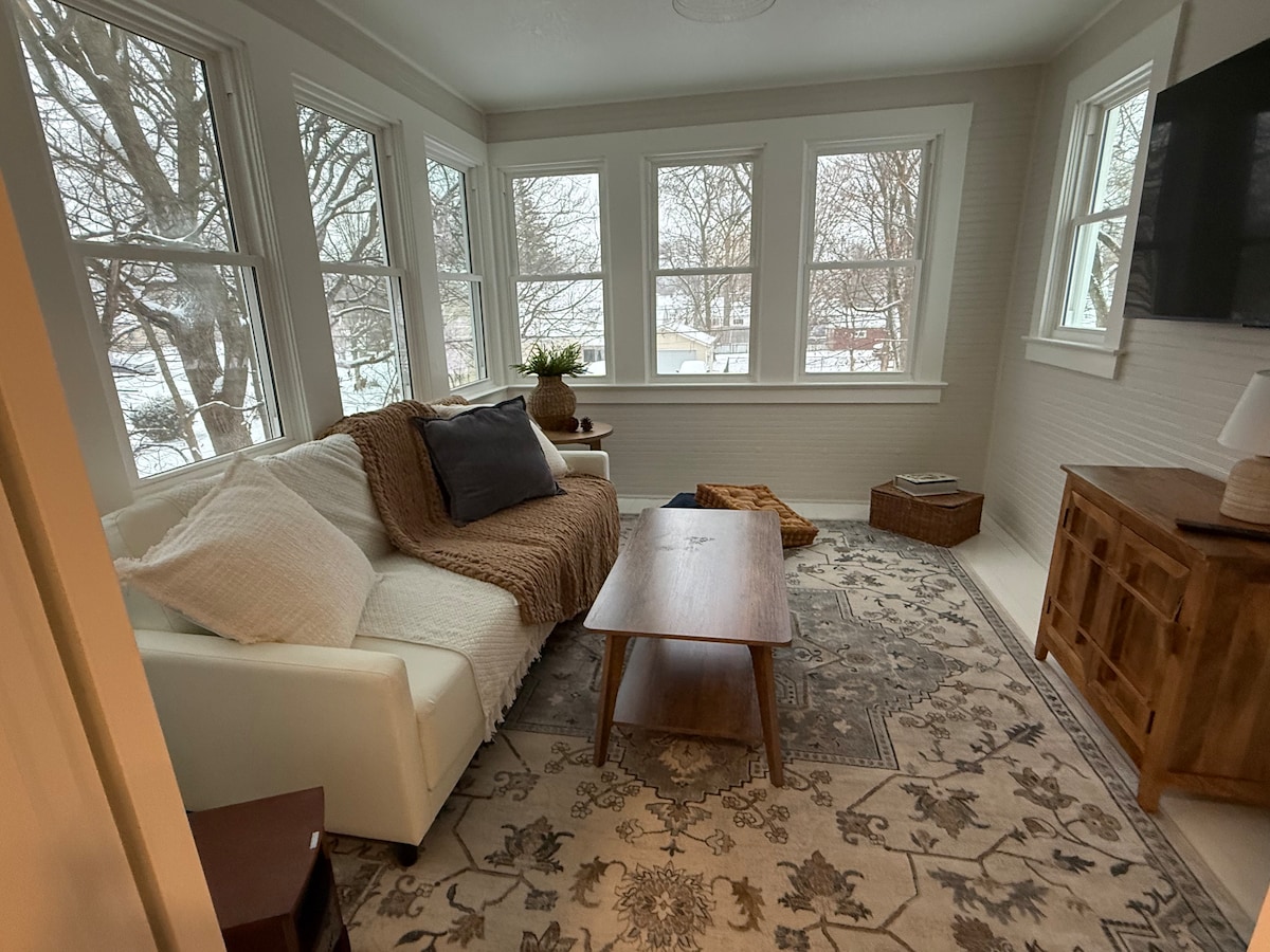 This upstairs spacious studio apartment is cozy and an ideal space for a traveling worker. Close to all the major hospitals, GM, google center and airport yet far enough to enjoy small town tranquility. The wood paneling and electric fireplace in the living room yield a cozy, cabin vibe. The spacious bedroom features a king size bed. Drive time to main hospitals and airport: -30min to PRMC -20 min to Lutheran Hospital -22 min to google date center -15 min to Ft Wayne Intl Airport and GM