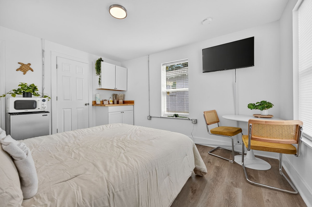 Welcome to our cozy tiny home located in my secured backyard, where a queen-sized bed promises a peaceful night’s sleep and our well-equipped kitchenette simplifies meal preparation. You will have free parking in the backyard located just steps away from the tiny home. Additionally, you’ll have the opportunity to gather around the outdoor fire pit for cozy evenings under the stars. Inside, unwind with a smart TV and stay connected with complimentary Wi-Fi.