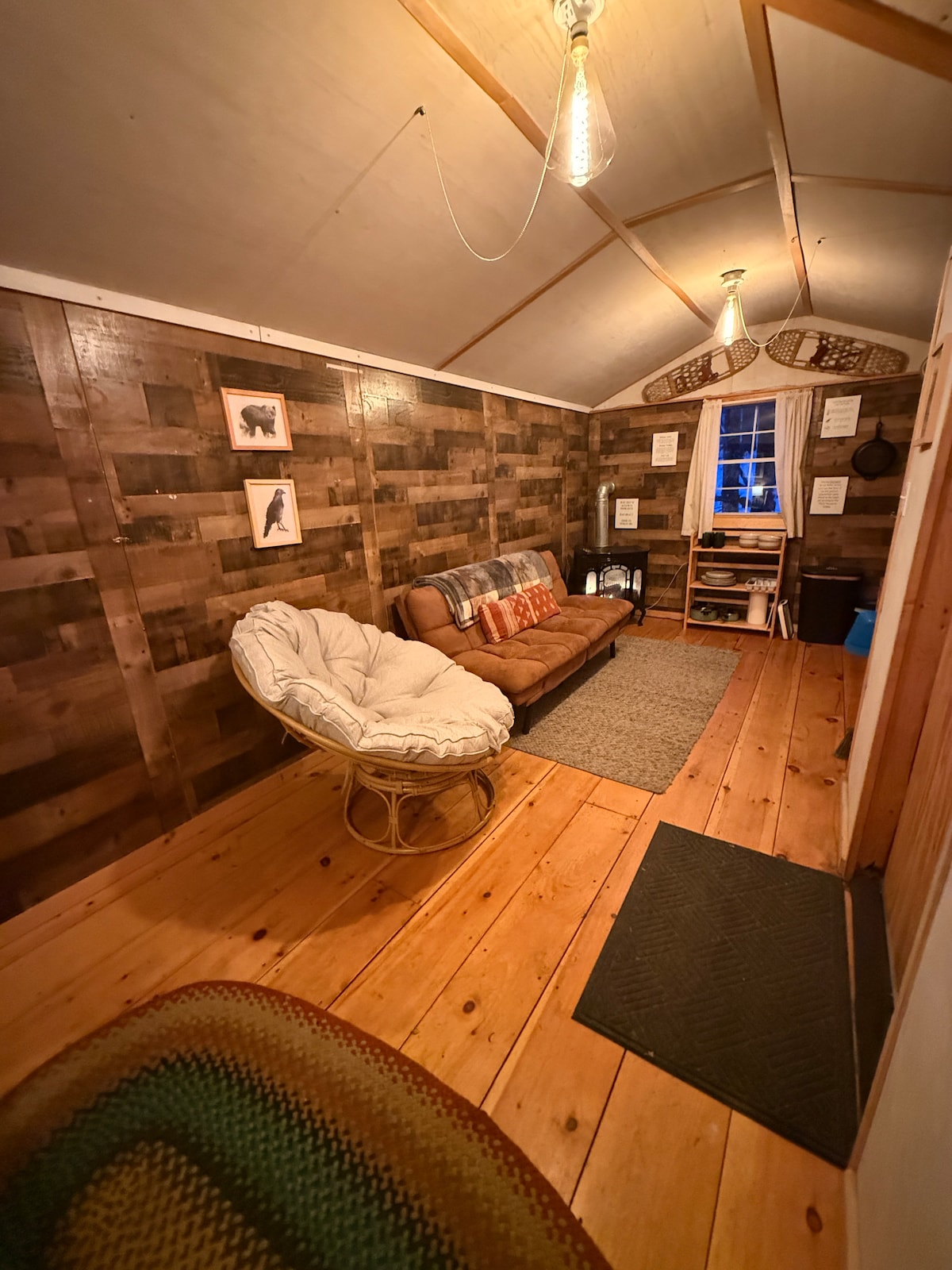 Rennsli Cabin is off grid + nestled on a forested plateau in the foothills of the Green Mountains. You will feel like you are in the middle of nowhere, unplugged and able to regenerate. Kitchen is equipped with cooking essentials, water, coffee, tea, milk, fresh eggs + homemade soap. It has an indoor compost toilet, outhouse + outdoor shower (May-Oct) Most seasons, the cabin is 100ft from parking, but weather conditions may require an 800 ft walk from parking at main house.
