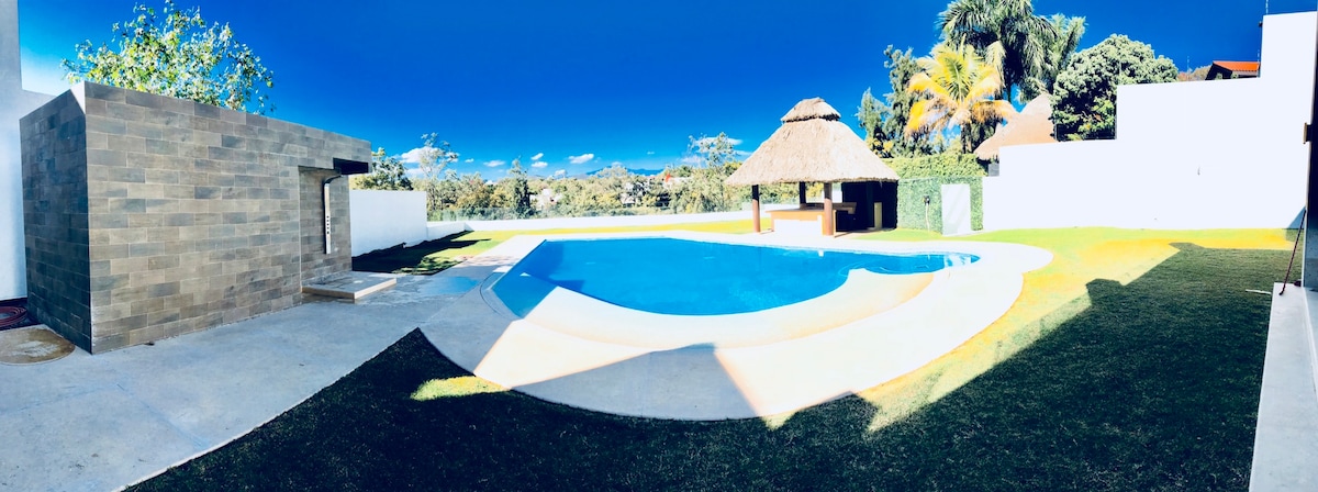 Vive una experiencia inolvidable! Cerca de Cuerna Disfruta con tu familia y amigos de la alberca y jacuzzi climatizados(sin costo adicional), diviértete en el jardín. En la palapa podrás escuchar tu música favorita , preparar una carne asada y ver cualquier evento en la pantalla de 55 pulgadas Se cuenta con wifi y sky Vigilancia 24 horas. Es una casa que te invita a escaparte de la ciudad y disfrutar de la naturaleza!