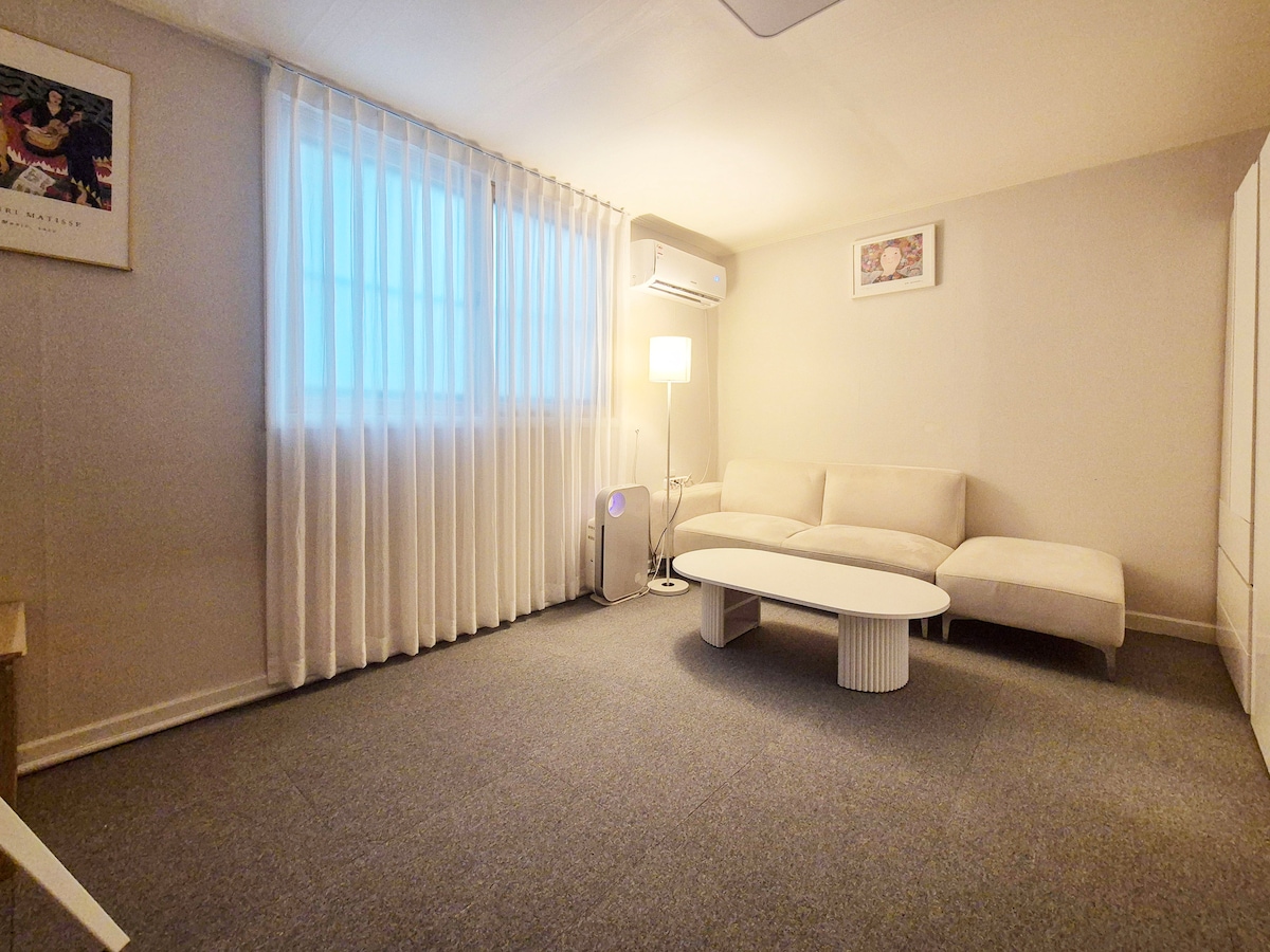 Moderne ruimte in de hoofdstraat van Dunsan-dong Inleiding Deze ruimte ligt in de hoofdstraat van het centrum van Dunsan-dong, direct naast het centrum, dus het heeft een handige toegankelijkheid. Comfortabele slaapkamer en aparte woonkamer, compleet met veel voorzieningen Gedetailleerde beschrijvingen # Ligging - 1 minuut van het centrum van Dunsan-dong in de buurt van Tteokbanjip - Parkeren is niet mogelijk en nabijgelegen openbare parkeergelegenheid is mogelijk/parkeren is mogelijk op de weg voor de parkeerplaats in het weekend. (20.000 won per dag bij gebruik van de ondergrondse parkeerplaats) # Woonkamer - 55 inch smart-tv - Bank, tafel # # # # Slaapkamer - Queensize luxe bed - Voor kantoor- en reisplanning met een grote tafel en een Mac computer - Altijd schoon beddengoed # # # # voorzieningen - Giga Wifi - Droger wasmachine - Koelkast - Koffiezetapparaat - Alle kamersystemen airconditioning # # # # Keuken - Eenvoudige voedselbereiding beschikbaar - Keukenapparatuur en servies # # # # badkamer - Inloopdouche - Voorzieningen # # # Huisregels - Roken is absoluut niet toegestaan - Geen huisdieren # # # In- en uitchecken - Inchecken: na 17.00 uur. - Uitchecken: voor 11.00 uur
